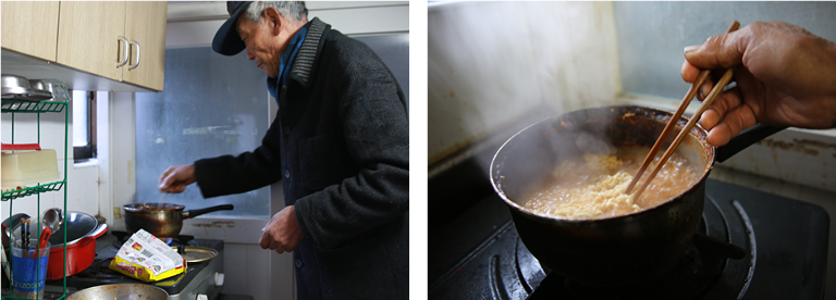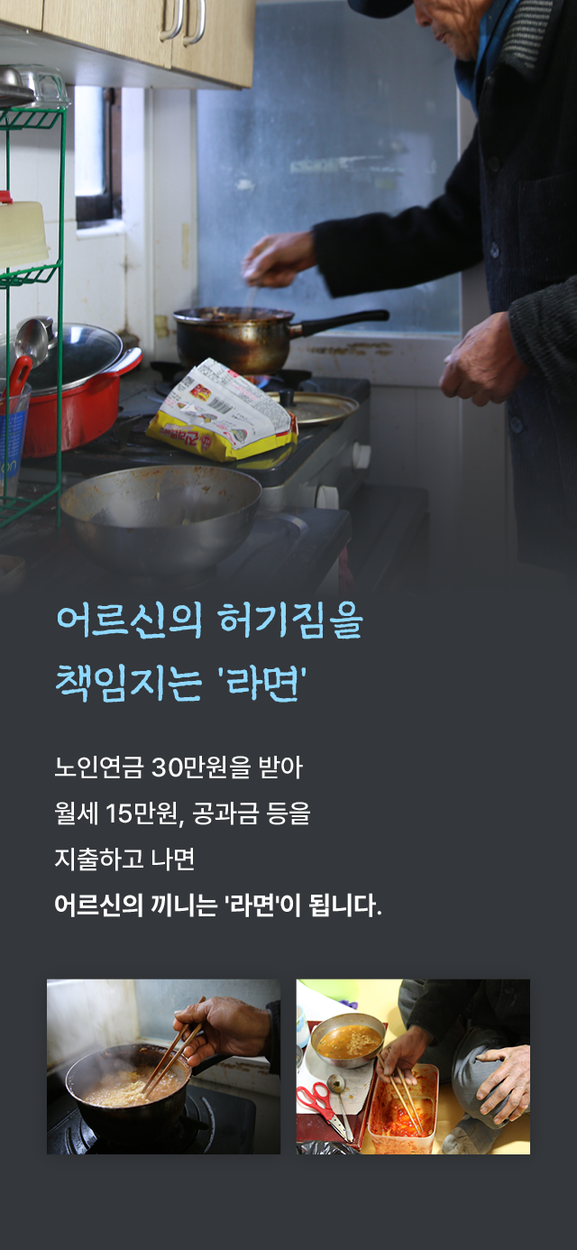노인연금 30만 원을 받아월세 15만 원, 공과금 등을 지출하고 나면어르신의 끼니는 '라면'이 됩니다.