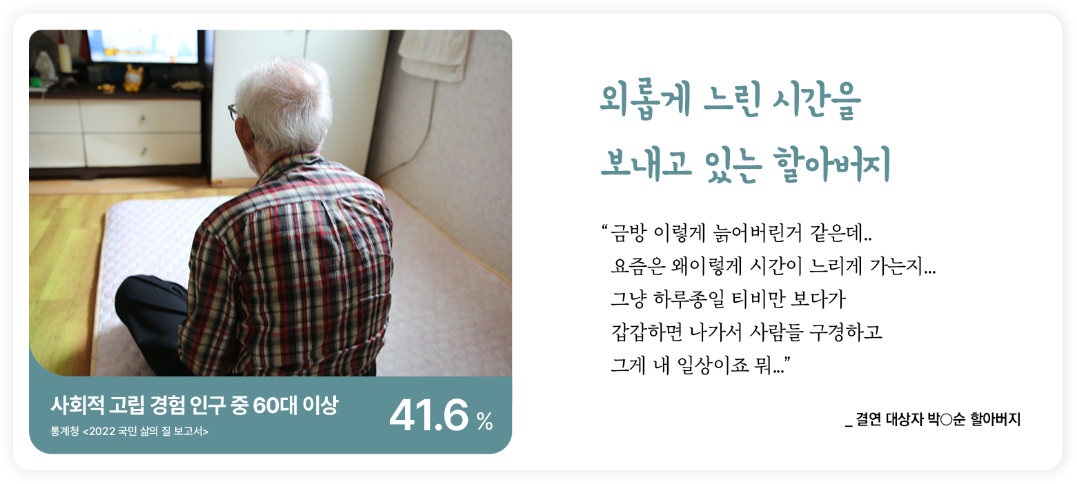 먹거리꾸러미와 함께 담당 사례관리자가 어르신을 직접 찾아뵈고 외로움과 고립감을 해결하기 위한 적절한 서비스를 연결합니다.