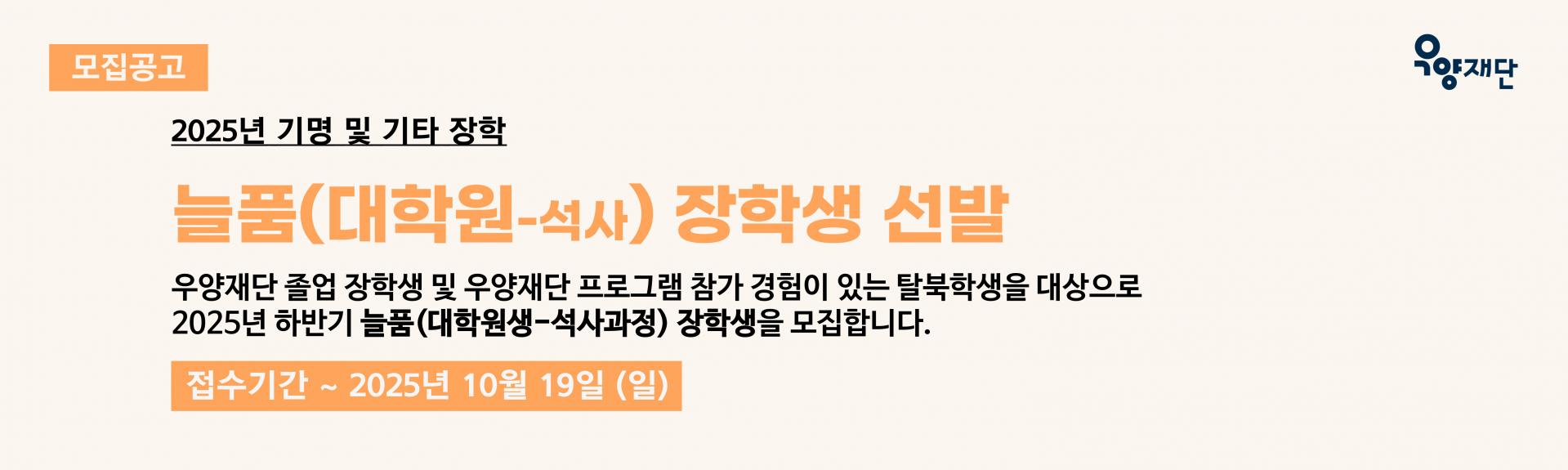 안녕하세요, 우양재단입니다. 2025년 하반기 늘품(대학원생-석사과정) 장학생을 모집하고자 합니다. 신청 안내를 다음과 같이 공고하오니 다음에 해당되는 학생은 신청해주시기 바랍니다.