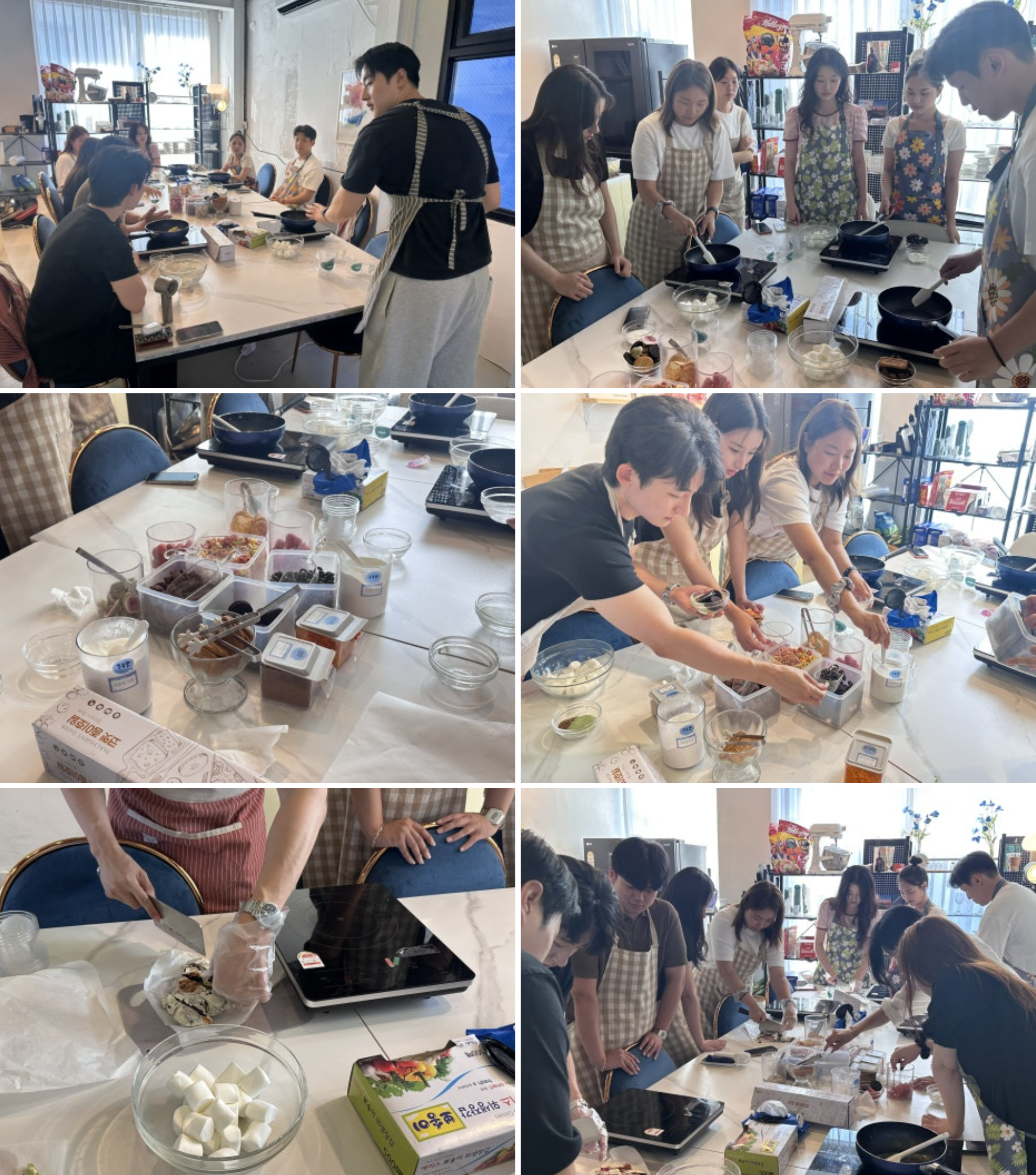 무척 더운 날이었지만, 장학생들은 삼삼오오 모여 예쁜 앞치마를 두르고 쿠키 만들기에 들어갔습니다. 2인 1조로 팀을 나눠 토핑을 고르고, 후라이팬에 마시멜로를 녹인 뒤 열심히 저어 기름종이에 평평하게 펴 담았습니다. 잠시 냉장고에 넣어 굳힌 뒤 한입 크기로 자르고 포장까지 마치니, 제법 그럴듯한 디저트가 완성됐습니다. 만들면서도 맛보고, 넉넉히 챙겨 각자 가져가기도 했습니다.